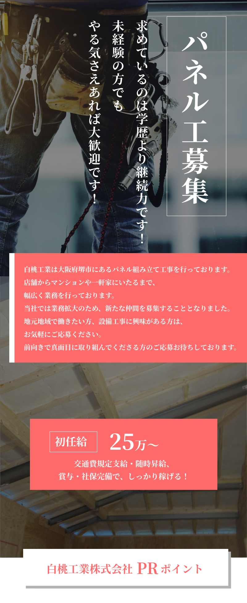 随時昇給、賞与(年2回)、社保完、昼食付 研修期間3ヶ月(短縮有)/日給1万円 安全靴・作業着有/空調服ok |